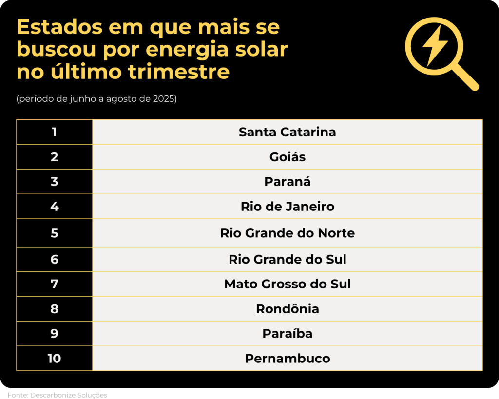 O estudo também levantou dados dos estados que mais buscaram por “energia solar” nos últimos 3 meses. Nessa pesquisa, o Sul novamente se destaca, com todos os seus estados presentes, e Santa Catarina ocupando a primeira colocação. Goiás ocupa a segunda posição, seguido pelo Paraná.