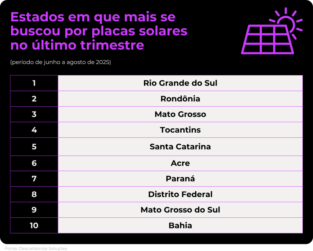 Entre os estados com mais buscas online por placas solares no último trimestre, o Rio Grande do Sul aparece em primeiro lugar, seguido por Rondônia e Mato Grosso, respectivamente. Tocantins e Santa Catarina completam o top cinco.